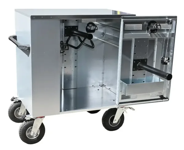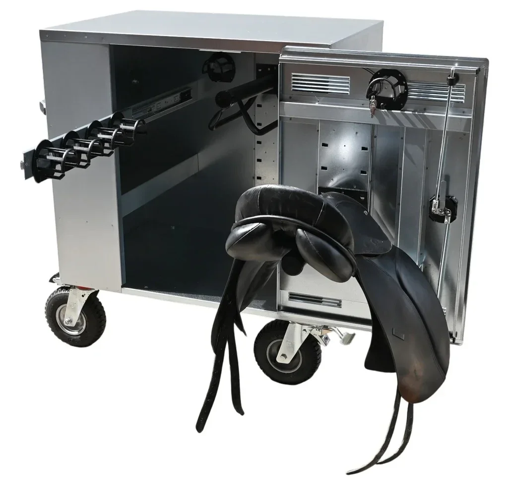Robuuste en praktische wedstrijdkast van gegalvaniseerd plaatstaal. Ideaal voor wedstrijden, stalgebruik of het vervoeren van voer, poetsboxen en uitrusting. Dankzij de luchtbanden met noppenprofiel en 2 geremde zwenkwielen rijd je moeiteloos over elk terrein.